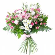 Ни одна юная девушка не сможет не оценить нежную композицию из хризантем. Утонченный комплект сочетает в себе ромашковые хризантемы и розовые альстромерии. Особого изящества придают кустовые розы, которые подчеркнут чистоту намерений. Букет поможет привлечь внимание понравившейся девушки на первом свидании и попросить прощения у любимой женщины.